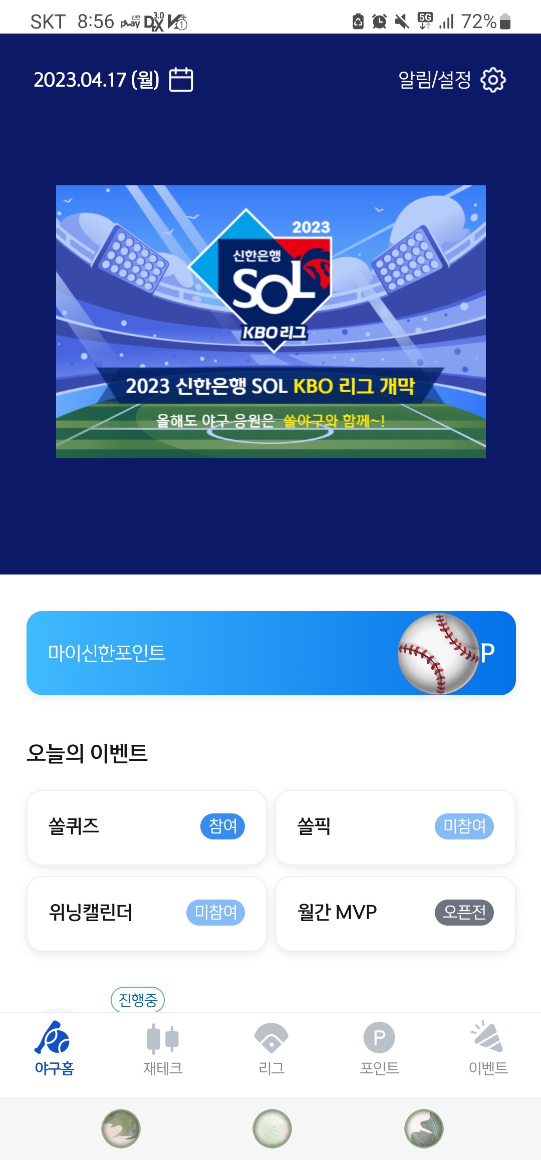 적금에 가입하고 아래 구석에 보시면 쏠 야구가 있어요~