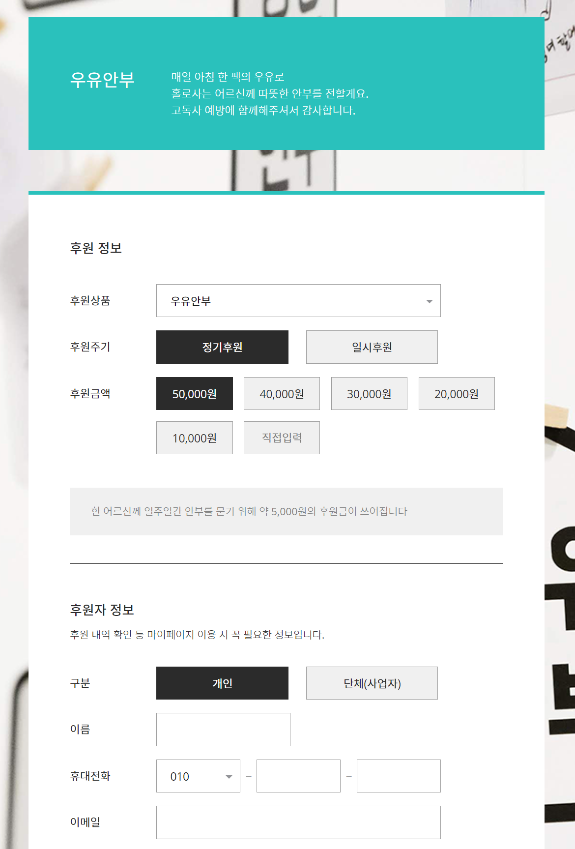후원하기를 누르면 이렇게 후원 주기, 후원금액, 정보 등을 기재하는 새 창으로 들어가실 거예요.