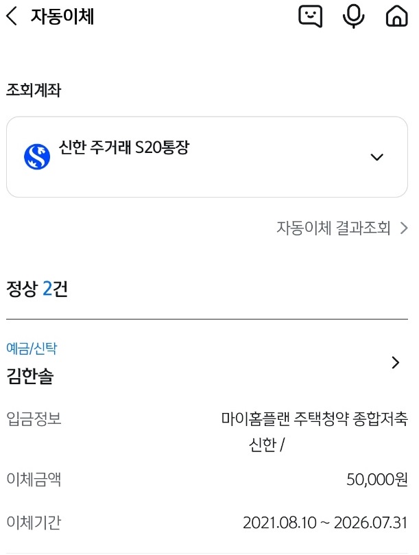 출금계좌와 입금(주택청약) 계좌를 확인 하시면 중간에 [ 이체금액 설정] 을 확인 하실 수 있습니다.