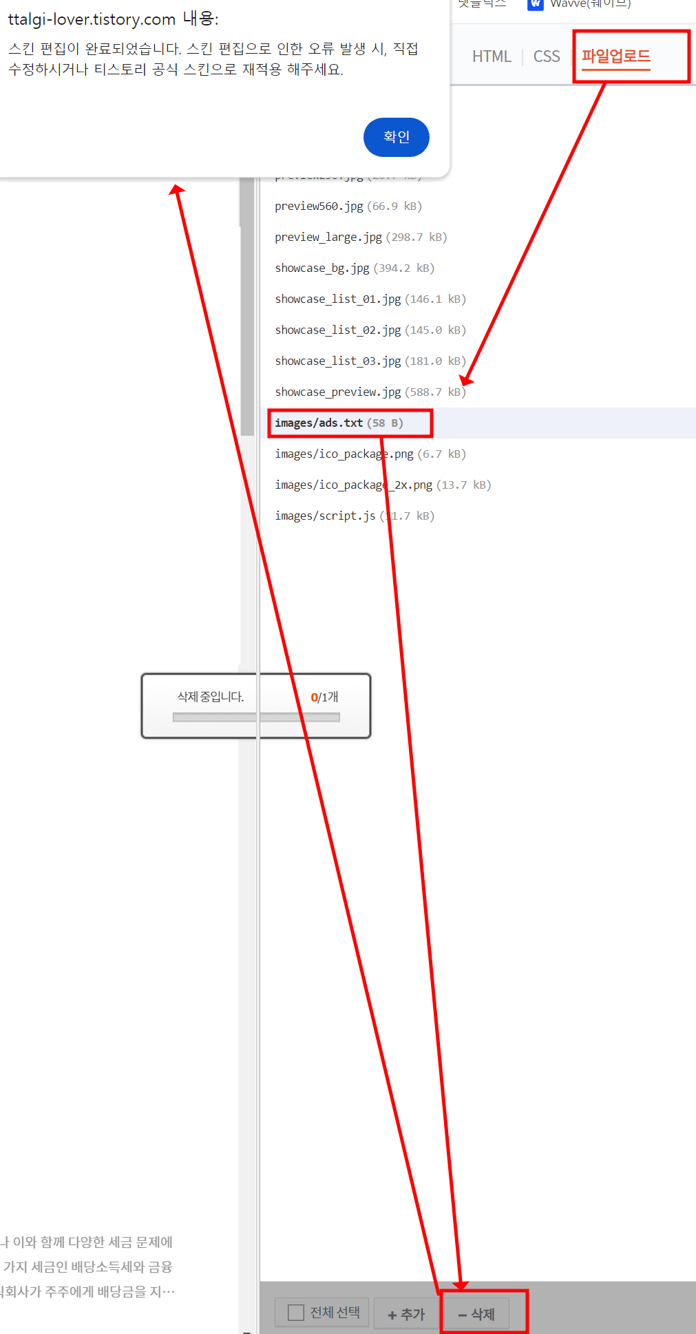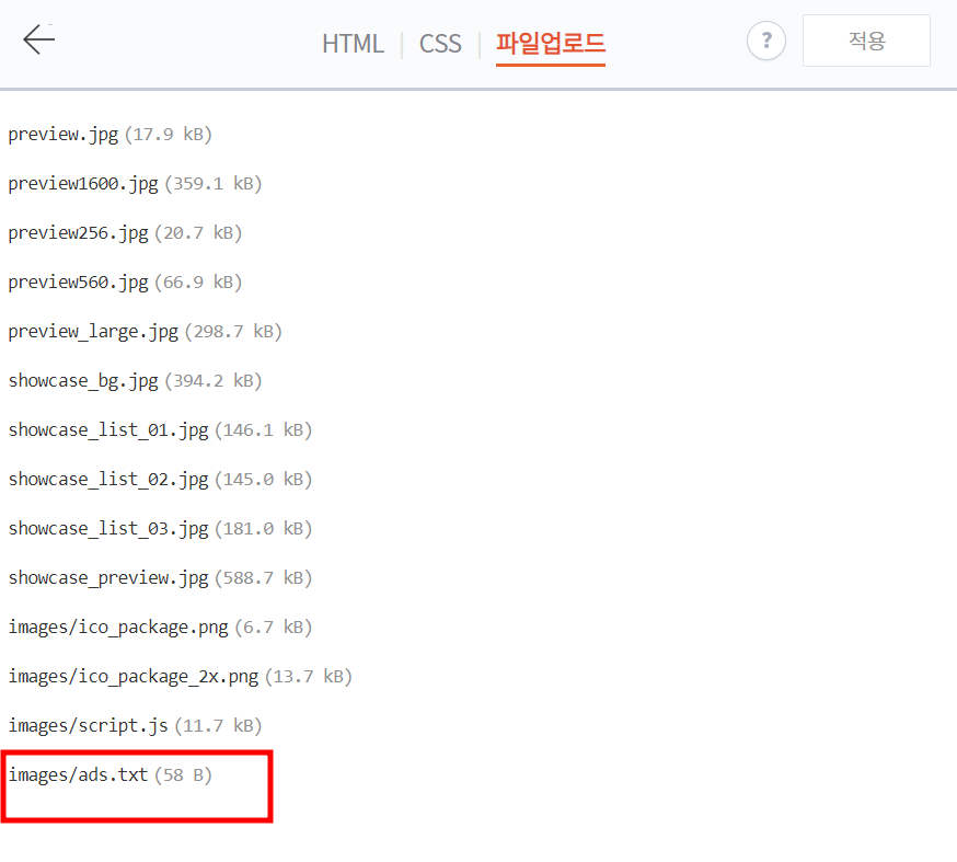파일업로드 > 기존의 ads.txt 클릭 > 삭제 를 합니다.