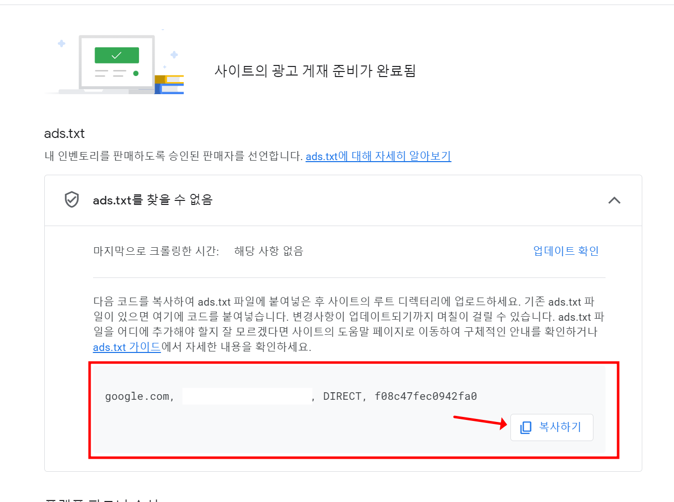 모든 준비가 완료 되었으니 ads.txt 상태가 찾을 수 없음 > 승인됨 까지는 시간이 소요가 됩니다.